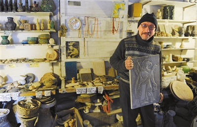 1月9日,在叙利亚大马士革城中的传统工艺市场,石雕手工艺人巴达尔展示他的仿制手工艺品《亚述帝国时期神话人物》。