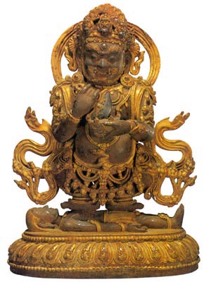 天黑天梵文音译为玛哈噶拉,是藏传佛教的护法大神,观音的化身。 此像为罕见的铁镀金像,裸露的肌肉的铁的原色,以应大黑天颜色。宝冠、璎珞、飘带、莲座等处镀金,色彩对比鲜明。大黑天三目圆睁,须眉立起,怒目而视。头戴五骷髅冠,发髻正中有化佛一尊,左手托嘎巴拉碗,右手持银制钺刀。两短腿作蹲踞姿势踏仰卧神,全身披挂网状繁密的璎珞珠饰,身绕飞卷翻动的飘带,形象怒而不凶,憨态可掬,雕刻精细入微。座面刻汉文款识"大明永乐年施"。这是明永乐年间宫廷制作的佛像珍品。