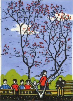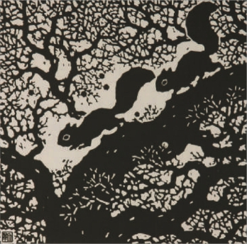 20世纪80年代的代表作品中,黑白木刻《林间》描绘了深秋时节积山林间松鼠跑跳嬉戏的景致,既表现了他对小松鼠的喜爱之情,也表现了生命的欢跃。“他出门时一定不忘的是他的速写本,画《林间》时,还在家里养了小松鼠,每天靠在笼子边逗它们,观察它们。 ”郝黎回忆父亲对待创作的一丝不苟,“我上小学后就开始给他做模特了;他想观察大襟衣的褶子,就让妈妈特别给我做了一套,让我靠在床上,他仔细看衣服上的褶子;他创作《学习》时,我拿着搓板装做洗衣服的样子,他就笑。 ”