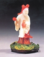 有一种常见“半宝石”玛瑙,价钱不贵,古今不少工艺师把质佳者雕成鼻烟壶、人像和各种陈设品。例如附图,就是清代佚名雕刻之红白玛瑙人物立像,捧寿桃、背葫芦,高仅十一公分。其最大特色并不是雕艺;而是利用天然红、白二色的优质玛瑙作材料,随“色”赋形,巧雕成像。寿桃、葫芦、帽子和一双脚,均为红色;这些红色部分皆石头自然分布而成。工艺师心思灵巧,索性用这些部位变为形象化,可说匠心独运,构图设计特别。