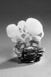 一件清中期的和田籽料俏色雕《螃蟹和菊花》引起了笔者的注意,这件高7.7厘米,宽6.7厘米。利用带青花的和田白玉籽料,将青花部分雕成一只螃蟹,将不带青花的白玉部分雕成两朵盛开的菊花和一朵菊花蓓蕾。整器运用镂雕、减地隐起浅浮雕和推磨技法,传神地表现出两者结合以后的勃勃生机。一只青壳大闸蟹,右侧四条步足自然屈曲,左侧的第一、二步足微微张开,指尖紧扣在菊花梗上,第三、四步足紧紧抱住花梗的下端,整个身体微微向左倾,这些细节生动地表现出螃蟹的左侧四条步足攀住花梗时的用力状态。螯足的腕节、指尖刻划地十分逼真,由于螯足的指尖紧紧钳住两枝花梗,把花梗都钳扁了,左右螯足的腕节由于用力而伸展开来。创作者通过这些细节告诉我们,这是一只极富生命力的活螃蟹。两朵盛开的菊花中间花芯部分阴刻网格纹,锯齿状花瓣由里向外共分三层,用减地隐起浅浮雕技法雕琢,富于层次感。还有一朵蓓蕾即将绽放,以减地隐起浅浮雕技法琢刻从蓓蕾中伸展开,但尚半卷着的花瓣。数枝花梗,几片叶子呈自然交错状。整体视觉感很美。玉质温润,包浆自然,岁月的痕迹更增添了美感。