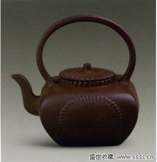 此紫砂壶壶身四面和壶底各贴饰菊花纹,主要采用模印贴花的装饰技法,制作出对称的放射状棱瓣泥片,贴附壶坯后,略加修饰即成。壶盖与壶底为同一模型,内圈围绕16瓣阴纹,外圈扩为32瓣阳纹,在光影映照下,颇见律动之美。壶身四面贴饰的菊花纹更为繁复,既如盛开仰菊,又如孔雀开屏,尤为可观。三弯流嘴与长虹般的提梁,从壶身胥出,与壶身装饰两相映照,一繁一简,一虚一实,构成完美的空间感。壶口内侧平滑,未如其他筋纹器内外均做弧瓣,这是较折中的做法,既有筋纹之美,又有省工、实用(壶盖易进出)之利。CDn-WWW.2586.WANg南京博物院所藏一件同形提梁壶,造工更为精美,有趣的是这两壶的菊瓣模型完全一致,显为当年出自同一作坊。