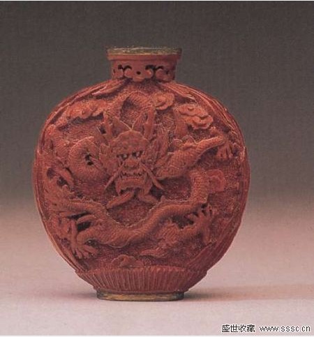 像明、清剔红漆器中,一些御用精品乃以龙纹为主,用云纹、火纹、锦地纹等衬托。由于剔红漆器纯属赤红色,故更能彰显赤龙的形象。例如附图之剔红漆鼻烟壶,为清代乾隆时期所制;沿用历来繁复方法与程序,在器面髹饰数十层漆,堆积成一定厚度,始于红漆上雕刻龙纹;技巧难度甚高,但刻出线条笔致秀丽而遒劲,宛转曲,活灵活现;不但展示精美华丽一面,更把赤龙之尊贵威严显现。