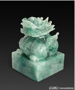 翡翠中不乏以龙为题材的精品,但以带翅的应龙为主角的的确不多见。应龙形态威武,生有双翅,鳞身脊棘,头大而长,吻尖,鼻、目、耳皆小,眼眶大,眉弓高,牙齿利,前额突起,颈细腹大,尾尖长,四肢强壮,天生一副作战的好身板。此翡翠应龙图章用料完整厚实,造型硕大,形体饱满,种质也较为细腻,采用写实的手法精雕一尊应龙立于印章之上。应龙全身的鳞片均表现清晰,边缘线条刻画明朗,每一片都像在跟着应龙的呼吸在微颤,龙角雕工刚劲,连角质纹理都能看清。胡须雕琢得尤为细致,线条流畅,随风仿佛随风轻摆。双翅羽翼丰满,每丝羽毛均清晰可辨,锋利的双爪紧扣地面,刚劲且有力,似乎马上振翅欲飞。双眼浑圆,炯炯有神,眉宇之间英气十足,怒视前方。两个大鼻孔,喘着粗气,一副蓄势待发的模样。祥龙口含一支如意,巧用绿翠突出了如意,两端飘上几抹艳绿,很是精妙。