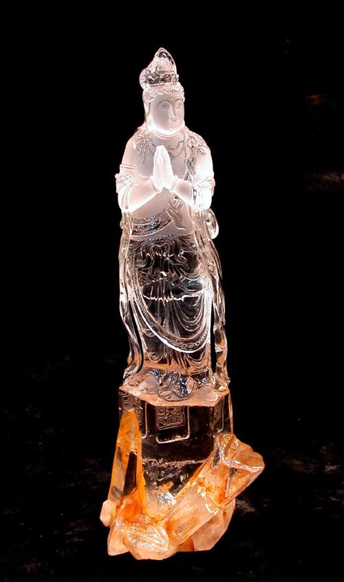 水晶《观音》作品10×30CM,以镂雕、圆雕等手法。以细腻的雕工把观音慈仁的表情刻画得淋漓尽致,作品采用了喷砂工艺与水晶透彻的质感相对比,以雕塑艺术匠心独具的艺术构思,完美再现了高超的雕刻工艺,使作品富有非凡的神韵。