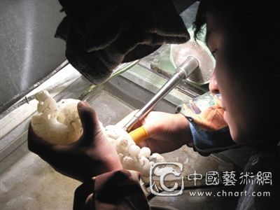 工作人员正在进行精品玉器雕刻