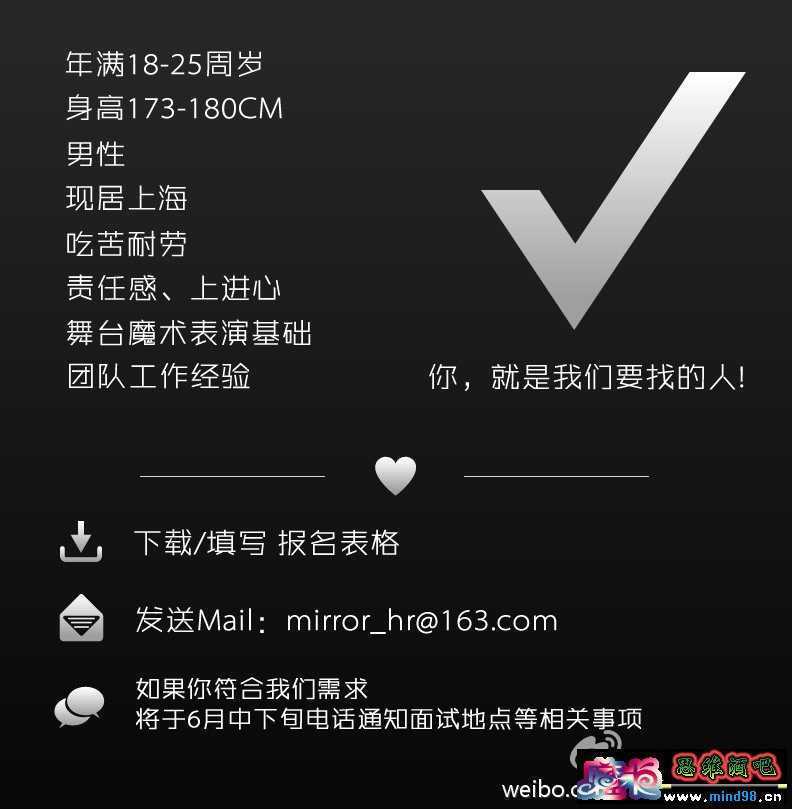 年满18-25周岁 身高173-180CM 限男性 现居上海 吃苦耐劳,具备较强的责任感、上进心; 拥有舞台魔术表演基础、团队工作经验者为佳。 国内最顶尖的魔术团队诚邀你的加入!
