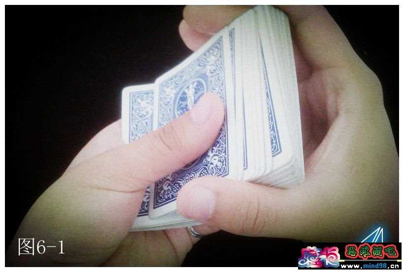 $ L- V' C( r. B( l% } 如果用双切啊……什么的,很好!你掌握了一些魔术技巧,可以很好的处理这个控底的手法。但是,观众会觉得这个动作很奇怪,为什么要切啊切的。其实用最简单的方法——Over hand shuffle(图6-1)就可以很自然的做到了。有时,越简单越好.