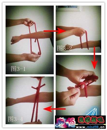 当初看到这个魔术的时候,我也拿出了2根橡皮筋摆弄。第一个想到的,便是类似的一个魔术:将一根绳子系成绳圈,让观众把手臂伸出,将绳圈放在观众手臂的下面。在数过1,2,3后,绳圈神奇的跑到手臂上面去了。方法如下:(图)