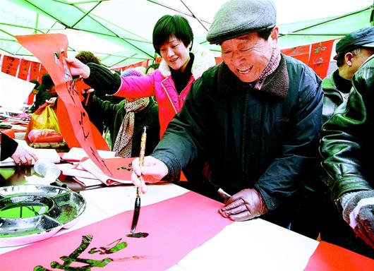 16日,武汉市江汉区民族街计生协会、文体站组织“写春联送爱心”活动走进万年社区,20余名老年书画家现场挥毫泼墨,送出“个性化”春联300余副,居民们乐开了花。 (倪娜)