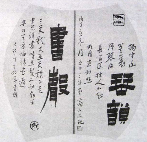 三、书体与形式的和谐。篆、隶书多厚重古朴,大草多昂扬畅达,此三种书体写得字径稍大,更能表现字体自身特性和书写者的创作水平。小楷、小草和小字行书,如果要写成较大的扇面,章法上要随形就势、灵活多变。