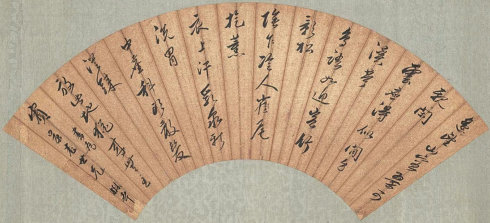 七、雅。扇子、扇面书法多是文人雅士互相馈赠,托物寄情以及雅玩的小品,因此,扇面书法的创作,从形式到内容要给人以雅、静、淡的感觉,而不能粗糙、俗气、霸悍。以上所述都要围绕这一“雅”字展开,书写时充分发挥材料的特性,发挥水墨的韵味,讲究技法的精妙以及章法的生动自然,使之畅达不漂浮,质朴不笨拙,昂扬不张扬,耐人品味。