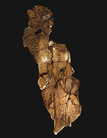 牛头刻辞 年代:远古时代 类别:骨器 规格:长39.5,宽17.5公分 出土地:小屯横13.5丙坑出土 简介: 民国十八年第三次发掘所得,为第五期的记事刻辞,记载获得白兕及征盂方的事情,盂方是殷的敌国。全篇文字用刀来回刻出,有如双钩,字体风格与金文较近。