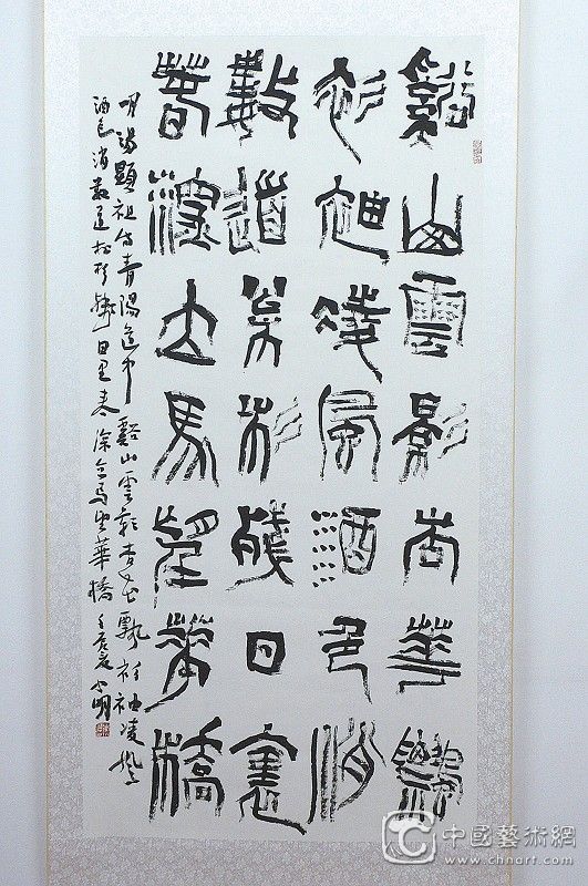 李小明的书法创作不仅真草隶篆行兼修,而且各体都具不同流俗的审美层次。各体都十分讲究个人的风格,坚决不让它混同于熟见的古贤时俊。而李小明这种不同于他人的艺术风格,还呈现着审美取向上的多元复杂和融合,就像西安名吃羊肉泡馍,鲜香浓郁,让人舌根生津,满口含涎,却难以说清究竟什么滋味。尤其李小明的篆隶和行草书,更是神出鬼没不可端倪。