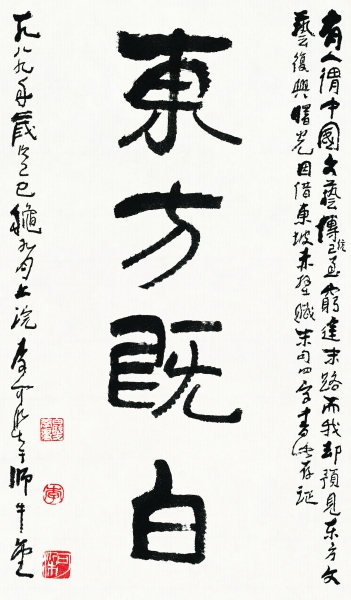释文: 东方既白。有人谓中国文艺传统已至穷途末路,而我却预见东方文艺复兴曙光,因借东坡赤壁赋末句四字书此存证。一九八九年岁次乙巳秋九月上浣。 “书法作为体现中华民族性格的文化符号发展至今,其魅力不仅在于外化的章法、结体与笔法的审美趣味,更多的是对于千年来中国文化传统的吸纳与凝聚。” 没有隆重的开幕式和花哨的宣传,一幅幅经典的书法作品陈列在灯光柔和的展厅中,耳畔是琴声古韵,一股浓厚的文化氛围顿时浸润着观者的感官神经。1月29日,“文心墨韵——北京画院藏书法作品展”就在这样的环境中悄然拉开了帷幕。 此展览涵盖了20世纪中叶国家政要、文坛名流及著名艺术大师的书法作品70余幅,几乎涉及了当时文化圈方方面面的重要人物。CDN-wWw.2586.WAng作品除极具视觉冲击力和观赏性外,更具有重要的学术和文献价值,可谓翰墨汇聚、风雅独盛。此展系北京画院藏作品系列展的延续,也是北京画院弘扬祖国传统文化的又一重要举措。 百花齐放,百家争鸣 此次展览的大部分作品集中在20世纪五、六十年代。一进展厅,郭沫若书写的“百花齐放,百家争鸣”便赫然映入眼帘,这近乎口号式的理念以书法的形式表现出来,似更具有一种唤醒时代的力量。50年代初的中国,无论在经济还是文化上皆呈现出一派欣欣向荣、奋起勃发的景象。1956年4月28日,毛泽东在中共中央政治局扩大会议上说,艺术问题上的“百花齐放”,学术问题上的“百家争鸣”应该成为我国发展科学、繁荣文学艺术的方针。该方针一经提出,便成为了中共中央关于科学和文化工作的重要指导思想。展览中多幅作品都书写了与此思想相关的内容。此外,还有一些作品表达了对伟人的颂赞之情。如李济深《毛主席北戴河浪淘沙词》、秦仲文《清平乐·会昌》、于非誾《沁园春·雪》、朱德《承旧启新》等。 在此种大文化理念的催生下,1956年9月,中国书法研究社在北京中山公园来今雨轩创立。展览中展出的章士钊、溥雪斋、叶恭绰等人都是其成员。中国书法研究社是新中国第一个群众自发组织的书法团体,成员几乎囊括了当时北京的书坛名流,系中国书法家协会的前身,为新中国书法事业做了许多卓有成效的工作并培养了启功、刘炳森等后一辈著名的书法家。 此外,齐白石、徐悲鸿、于非誾等著名画家的书法作品也一同亮相,使我们在了解他们的绘画艺术成就之外,更加领略到其书法艺术的魅力,从而对这些大师们有了更为全面的认识。与此同时,也更加体会到“书画同源”的道理,书法之于绘画的重要性也藉此凸显出来。 书法本体与文化涵义 在历史的长河中,一幅艺术作品传承的不仅是绘画或书写技艺方面的内容,在历经时代沧桑后,更为人们所记住的是它其中所蕴含的文化内涵和历史积淀。 此次展览中,老舍先生的新体诗“村村生产忙,稼穑大文章。引水防迟雨,流烟拒早霜。春多集体汗,秋富万家粮。解冻闻初雁,东风云海香。”描写了上世纪60年代初期社会主义经济建设的场景,表达出作者对祖国发展的美好憧憬和祝福。整幅作品清雅且趣味性极强,拥有着书法和文学上双重的重要价值,更从侧面反映出了那个时代的文艺工作者特有的艺术表现方式和对祖国建设事业怀有的单纯、美好之情怀。 李可染先生所书《为祖国山河立传》《用最大的功力打进去,用最大的勇气打出来》给人印象深刻。后一幅作品的右侧有两行小注:“祖国绘画传统古老而精深,学之不易,突破尤难。四十年代吾有志于继承和发展,立此二语为座右铭。”作品虽写于1986年,但提出此理念则是在40年代。这是李可染先生毕生所奉行的艺术理念,是对继承和变革、延续和创新、致敬和突破的最好注释,也是对关于保持文化延续性的最好理解。此幅作品是以李可染独特的“酱当体”写成,这种沉实厚重的书体是集颜真卿《八关斋帖》、魏碑、汉隶诸帖之长的一种字体。上世纪60年代,“文革”中的李可染很少作画,常以习字为日课,这段时间里,他逐渐领悟到:“字体削瘦容易,丰厚难。就像人的肢体,要有骨力、有弹性、苍而润。瘦笔只见骨头,比较容易,若在丰厚之中见出筋力就好了。丰厚比瘦削好,传世多颜字是有道理的,颜字有庙堂之气。”自此,他的字便从轻灵优美转为沉实厚重了。 用此种书体写成的还有《东方既白》书轴。此幅作品通篇给人以沉稳、宽博、大气、雄健之感。其结体意方而用圆,字势开张。其点画圆劲,用墨酣饱,时有飞白,行笔如锥划沙,具有动感,有很强的篆隶之意。《东方既白》中的“既”字左正右斜,左平右险,“东”字左撇的墨韵干辣,右捺的墨味腴润。又,“东”字的“曰”部右下开而不收,“既”字的“艮”部在左上方“开口”等,这种对比十分微妙且别具意趣。 所以,沈鹏先生说:“书法既是李可染的余事,也是他的全部艺术活动的重要部分。说余事,因为书法只占用他从事绘画以外的较少时间,并且与绘画的数量比较占据次位。但是,从书画理法相同的意义来说,从笔法与结构的最抽象的原则来说,书法就不仅不是余事,而是可染艺术十分重要的基础工程了。” 弘扬书法艺术需沉潜的心态 “书法作为体现中华民族性格的文化符号发展至今,其魅力不仅在于外化的章法、结体与笔法的审美趣味,更多的是对于千年来中国文化传统的吸纳与凝聚。”展览前言中如此写道。 