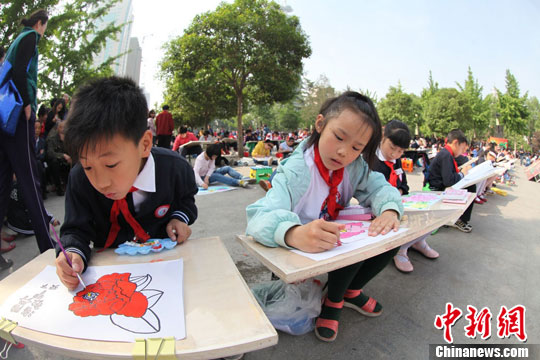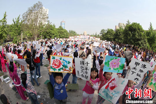 近日,河南省洛阳市千余名少年儿童在当地的周王城广场共同现场作画,描绘牡丹。康留国 摄