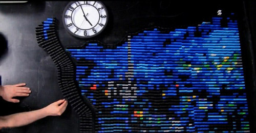 据报道,这名艺术家是经过两次尝试之后,才最终完成这一杰作的,第一次是因为一颗螺丝脱落,导致未能完全将多米诺骨牌放倒。经过二次调试后,他最终将杰作完成,7000多块多米诺骨牌倒下,展现出梵高名作《星空》的图案。