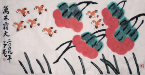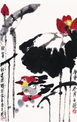 西方艺术评论家认为他的花鸟画,已完全超脱自然主义的描绘范畴。他所画的鸟,有生动活泼的外形,富有鸟类的共性。尤其是那富于节奏运动的荷塘枝叶布满画面,彼此呼应而又有韵律感。那已抽象为横强竖直的《玉兰》、《豆荚》、《梅花瓣》以及《鸡》,已将乱发挥到极致,令人目乱心迷,又能“乱”而不乱,乱中求整,浑然天成,具有很多抽象的意趣、个性、典型化、理想化特征。与传统的大写意相比,清楚地向人们展示了它明显的时代差异和不同的追求。最令人激动和佩服的是:其创新,是立足于现实,致力于对本民族文明优势的开发和现代审美价值的再创造,发挥它内在的潜力和民族艺术大师们的追求,进行成功的尝试。