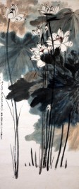 只见荷叶林中,几朵白荷迎风怒放,片片花瓣次第展开,数支绿干从水草丛中袅袅婷婷地伸出水面,荷干虽然细长但不失苍劲,有的直立如坚硬的箭镞,似要刺破苍穹,气势劲挺;有的慵懒地伸着懒腰,就像一个刚出浴的仙女,尽显妩媚娇态。几片宽大如盖的荷叶或于微风中轻舒漫卷,或轻触荷梗,似在喃喃私语秋日情怀;它们交相掩映,重叠舒卷,墨色浓淡多变。而荷叶上有的筋脉分明,有的则一片模糊;有的绿意缤纷显示出生命的活力,有的黄叶枯卷正一点点失去原有光泽。在复笔点缀之下,荷花层次丰富,清亮秀润。画面下方几乎看不到水波,但作者通过对那些菖蒲、芦苇与荷干的勾勒,以及荷干下部颜色深浅的处理,让人又真真实实地感受到了水的存在,这也是荷塘宁静安然的真实场景。张大千曾说:“荷干在画中最为重要,等于房子的梁柱……要顿挫有势,有亭亭玉立的风致”,由此我们可约略窥见其绘荷艺术之一斑。