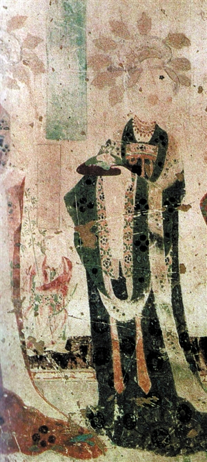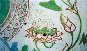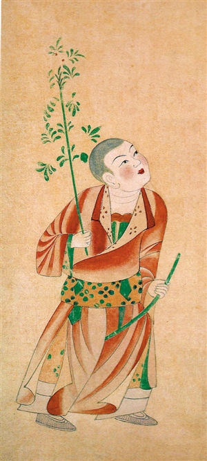 画面内容绘的是晚唐时期一群贵族供养人礼佛的情景,但在供养人行列中,一位贵妇人的右下侧画了一个身穿红色花袍、内着襕裤、足蹬平头履的小顽童,一条弯弯的竹竿放在胯下;其左手握“竹马”,右手拿着一根带竹叶的竹梢,作为赶马之鞭。cdn-Www.2586.WAng童子抬头向上,调皮地仰望妇人(图1、图2)。一群严肃的礼佛贵族妇女行列中,一个可爱的孩子骑着竹马在里面窜来窜去,很是充满了生活气息。