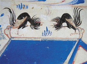 敦煌壁画中保存了一幅色彩鲜艳、形象生动的斗鸡图,这幅图位于莫高窟西魏第285窟南壁《五百强盗成佛图》中,画面上两只雄鸡竖毛振翼,悍目发光,引颈昂首,尖嘴利爪,正相对作伺机进攻状站立于屋顶,神态乃至力量感都栩栩如生地表现出来了。