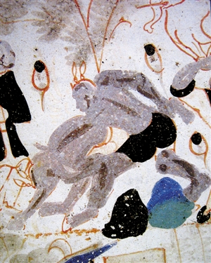 图2,晚唐第9窟东壁南侧骑竹马图(特写,李其琼临摹)。