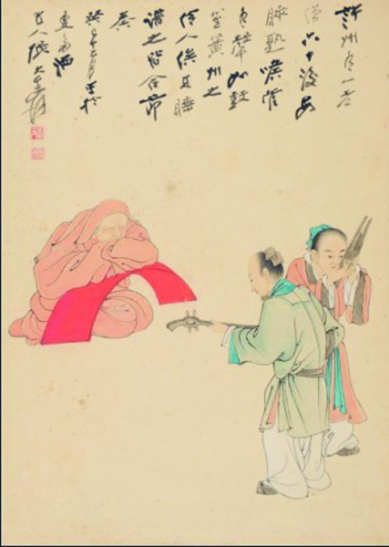 朵云轩2012年秋拍中,一幅张大千先生作于1953年的工笔重彩《许州老僧图》(54.5×38cm)以115万元成交。风雨一甲子之后,重读此画,方知大千居士又在游戏神通,为一狡黠之作。打开画轴,只见画上绘有三人,一老僧伏案而卧,另二人相背做戏,一鼓瑟而歌,一拍掌而歌,情节有趣而又使人莫名。及读到画上题跋,始知此作的画题源于一个典故。