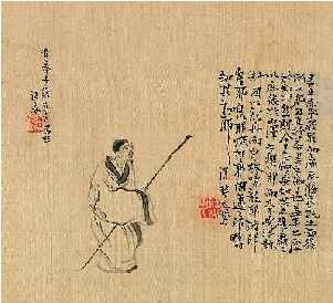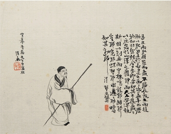 《背摹徐青藤先生自写照》册页(图1),是由清代晚期著名画家任熊所绘,现为杭州博物馆(原为杭州历史博物馆)收藏,为《清任熊人物册》中的第十册页。该作品为绢本设色,纵21厘米,横27厘米,画上题跋:“吾生而肥,弱冠而羸不胜衣,既立而复渐以肥,乃至于若是之痴痴也。盖年已历于知非,然则今日之痴痴,安知其不复羸羸,以庶几于山泽之癯耶?而人又安得执斯图以刻舟而守株?噫,龙耶?猪耶?鹤耶凫耶?蝶栩栩耶?周蘧蘧耶?畴知其初耶?渭。越日并录句。钤朱文‘渭长’印。”落款:“背摩青藤先生自写照,渭长。钤朱文‘渭长’印。”任熊是“海派”艺术的代表人物之一。字渭长,一字湘浦,号不舍,浙江萧山人。幼时家贫,跟塾师学画人像,后寓居苏州、上海以卖画为生。曾流浪到宁波,得遇名师姚燮,在其家“大梅山馆”学画,深得宋人笔法。画法宗陈洪绶,其人物、花卉、山水、翎毛、虫鱼、走兽,无一不精,是绘画全才。与弟任薰,儿子任预、侄任颐合称“海上四任”,又与朱熊、张熊合称“沪上三熊”。这幅册页所画人物线条遒劲,造型准确,神态生动,用墨浓淡层次分明、恰到好处,画上所配的款识紧贴人物主题,书法隽逸而老辣。2011年5月,北京宣石国际拍卖有限公司春季艺术品拍卖会上出现了与此册页类似的《背摹徐青藤先生自写照》册页(图2),纵21厘米,横23.5厘米,起拍价是5,000元至8,000元。两幅图对比:一是两图绢的颜色不同,拍卖的图2偏黄褐;二是人物造型两者看上去貌似,但细审(图1)杭州博物馆的线条干净利落,面部的细节精准而生动;而(图2)拍卖作品的线条柔弱、面部生硬;三是款识的书法两者比较起来差距更大,拍卖的生硬笨拙,其中“衣、大、人”3字,(图1)杭州博物馆的作品有笔画加粗的痕迹,而拍卖的不见此特征。四是题跋的印章,拍卖的是白文“任公子”,而杭州博物馆的是朱文“渭长”,以上分析,真假自然一目了然,拍卖的是摹仿杭州博物馆收藏的这一件。