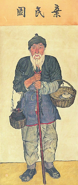 《弃民图》中那位失去土地、无家可归的老农民正是上世纪20年代以后中国农村问题的形象缩影,在这里可以回溯到近代以来中国农村的地权、租佃问题,从中看到力图向现代国家转变的社会体制在农民问题上遇到的困境。值得注意的是,“弃民”这个当时人们并不太陌生的概念恰好隐喻着进入20世纪的中国农民正成为世界现代化运动的弃民这一无情的困境——无论从社会体制管理和现代农业生产的推动或人道主义救助等方面,都面临着无法解决的难题。而在当时出现这种正面图式的农民形象,说明了艺术家对于流浪、乞讨农民这一群体的身份与尊严的承认、内疚与悲悯。