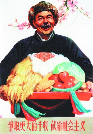 钱大昕描绘的老农双手捧着盛满丰收果实的大红漆盘,神情喜悦、笑容憨厚,身上的棉袄、头上的皮帽、身后的一枝红梅都和丰收的果实相互映衬,把丰收的幸福生活充分表达出来;而贴在雪白的棉花上的红色剪纸更为画面增添了一种喜庆和民间艺术的氛围。需要进一步思考的是,这位老农形象所代表的意识形态审美理想。作者精心刻画了老农脸上的皱纹、肤色和憨厚的表情以及张大嘴巴的乐呵呵的笑容,这种形象的塑造无疑是对那个时代的农民集体形象的理想化表达。他既没有《弃民图》中那位老农的流浪之痛、生活之厄,也尚未像“王国福”那样被建构为“胸怀共产主义理想”的英雄人物,当然也没有《父亲》心灵上的伤痕和迷惘。他是充满幸福的生产者和感恩者,他的叙事是属于“顺从-幸福-感恩”的类型。从某种意义上说,这一形象可以反映出上世纪五六十年代的主流意识形态对“教育农民”的价值期待和表述期待:朴实真诚的笑容、有说服力的新生活面貌、由衷的感恩和自觉的奉献。这与“文革”时期的那种“提高路线斗争觉悟”、“放眼世界”的王国福式的形象有着重要的区别,但又有内在的联系——他们分别是中国农民在意识形态主宰下的政治主体性表述的建立过程中的不同发展阶段。从“文革”农民宣传画回头看五六十年代农民宣传画,会感到有一种内在的发展逻辑在推动着宣传画的形象塑造的变化。