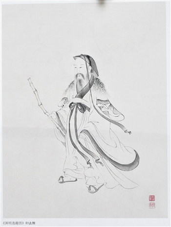 为破解“高士之谜”,彭成秋又跑到书店、书屋、书摊,翻阅了大量传统人物画册,甚至拍卖图录,但均未发现相关信息。直至2005年,谜底才渐次清晰起来。彼时,天津的“三宫”院内还是书市,彭成秋每天早晨都习惯到那里转一转。某天,他无意中在一个书摊上翻阅了一本《檀香山美术学院藏画集》,其中有一幅陈老莲画的《却馈》图,引起了他的注意。画中,陶渊明赤脚坐在榻上,摆手拒绝馈赠。虽然陈老莲画的人物体态古拙变形,线条也与先父所绘白描不同,但画中情节却使彭成秋眼前一亮,激动不已。他不禁自语“找到了!找到了!”原来,白描人物手卷中的高士就是“采菊东篱下,悠然见南山”的陶渊明。