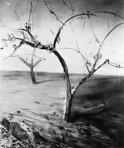 因受德国新表现主义的影响,艺术家故意在颜料里掺了大量的调色油,让它们自然流淌,并在画布中产生了如“屋漏痕”式的书法效果,那快速的笔触则将一种内在的精神外在化了。而在色彩的运用中,画家有意采用红绿两色去造成对比,以致造成一种特殊的效果。《桃花盛开》系列作品,表面显得异常放纵,但若细观看便会发现,绘画其实被一种理性的力量支撑着。