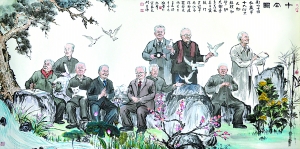 大师们生前经常举行雅集,如果把他们画在同一画面中,让十位老人相聚于山石美景之中,岂不更有艺术趣味。