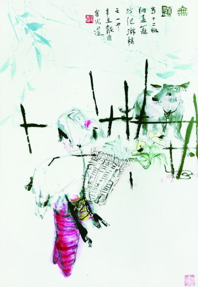 《版纳风情》是周昌谷以云南西双版纳的版纳勐龙沙为背景的纪游作品。谷雨时节,傣族小姑娘放牧回家,竹篓中一枝小花探出头来,初春的嫩竹迎风作舞,一派祥和美好的景象。作者运用传统花鸟画法于人物画中,笔法娴熟,形象概括生动,色彩明艳,赋予平常生活以浓郁的诗意。(天颖)