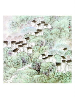 《圆陀山》圆陀山的山石多为圆形和椭圆形,在自然的景观中,不但石头如此,树冠也大多如此。画家在写生中把这些圆形树冠也画成了山石,又经过艺术的“酿化”、积累和提纯,山石树木等都趋向于“圆”的意象,在有意识的夸张强化下,最终表现出了画家心中的山水。画面左侧,是数幢黛瓦粉墙的民居,房屋皆成几何形构图,具备浓郁的装饰意味,给观者造成“熟悉的陌生”之感,带着隐逸的人生理想,恍若隔世。