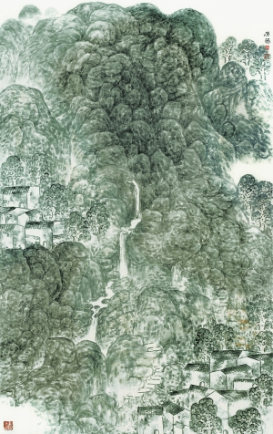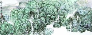 ▲《疏雨淡烟图》这幅作品画面构图简单,笔法简练,山石的结构随着五莲山的山石特点而又加以强化营造。CdN-WWw.2586.WaNg整个山峦和周围环境则染画成绿色色调,山与天空灰蒙蒙浑然一体,使人联想起夏天雨后山峦的景象。