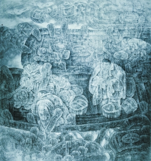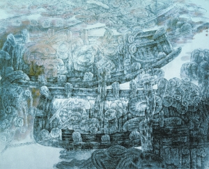 丁原禄的山水画笔墨取法范宽、龚贤诸家,大都以灰调子统领画面全局,反复运用皴擦、渲染、积墨、点染等技法,产生苍茫混沌、凝重敦厚的艺术效果。其画面层层累积,而能笔触松动透气,色调淡雅冷峻,又不失山林的苍润和蓊郁。但他的图式却又独特,笔墨亦有区别。细究起来,画家是从传统的“程式”中走出来,然后又回归到了自己的感性之根。