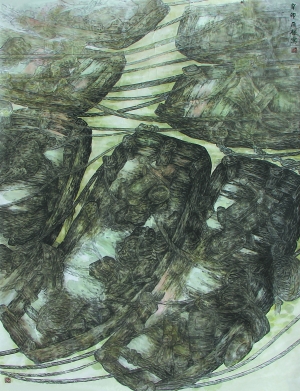 他的渔船系列同样运用了积墨法,层层积染,圆润厚重,较好地表现出了山东日照海边渔船粗笨古朴的造型特征。那些排列的渔船、缠结的缆绳、集束的罐子或漂子,组合成相当于山石累累的形状,留白的海水则相当于山间的烟云流泉。因此他的渔船系列既有类似山水画的整体气势,又有木制渔船的具体细节,通过平面中的排列、构成、重叠,形成了画面冷静、疏朗的节奏,进而表现出海边渔民原生态的生活场景,成为艺术审美的载体。