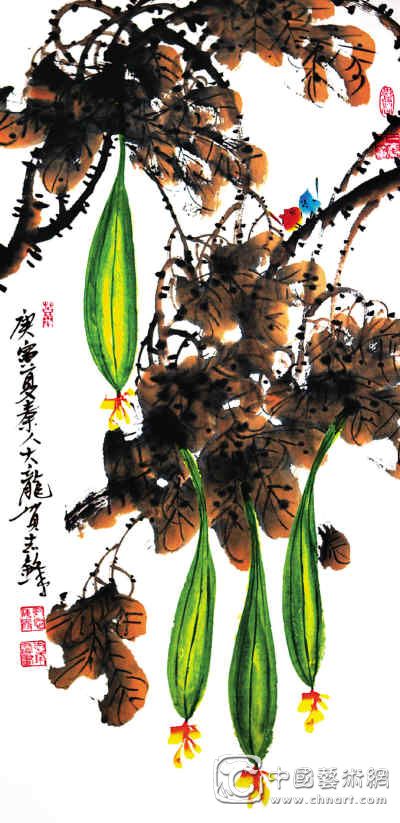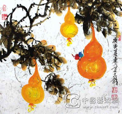 葫芦 贺志锋作 贺志锋的花鸟画,多取材于农家小院的寻常之物,表达的意境也总是一种基调:喜庆、祥和。他在谈到创作体会时说,“比如说石榴,石榴在中国传统文化中是多子多福的象征,那么我在画石榴的时候想得不是简简单单的一个石榴,我想得更多可能是一位慈祥幸福的老人。画如其人,不同的人画同样的东西,形态可能相似,但画的灵魂一定是不同的,因为画画时注入了个人的性格感受。”(思源)