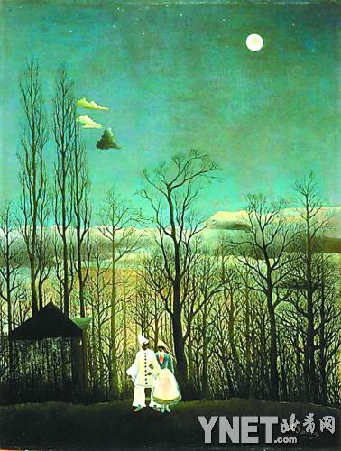 天空很高远,月亮挂在当空,小小的、圆圆的、清清白白的,有几朵或亮或暗的云彩在笔挺得直伸向天空的树丫间游移,她们是害羞的,轻轻地移着莲步。画面的前景是一派疏密有致的树丛,在树林中间隐着一间简陋的小房子;在树林前面的空地上,一对穿戴得相当隆重的青年男女安静地站在那里。他们穿着白色的衣装和衫裙,男子头上戴着尖顶白帽,女子则戴着彩条的船形帽。这可是平日里他们决计不舍得穿的衣物,他们一定是准备赴一场隐秘的奇妙的派对。而那派对的主人,可不正是童话王国的国王?他是一直存在的,只不过忙于世俗和自以为是的人们忘记了他的存在而已。而画面中的两个年轻人何其幸运,竟然有机会亲临这盛大的宴会,这不正是名副其实的狂欢夜吗!