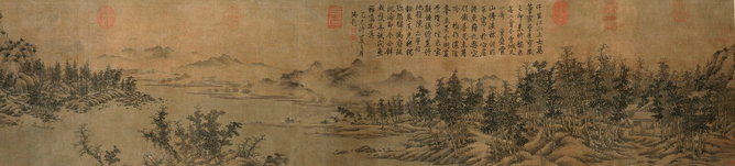 然而,方闻和班宗华都认为《溪岸图》确是董源早期的作品。班宗华在《20 世纪对宋代绘画的再造》一文中写道,1963 至 1967 年间,他那时还在普林斯顿念研究生,曾跟随方闻教授在大收藏家王季迁家看到《溪岸图》,和今天有很大的不同: “十分残破,画面黯淡失色,还有的局部已经完全失落了,只能在几英寸的距离之内,非常努力地辨识,才能看出画上的内容。绢面的磨损如此严重,以至于完全无法把握皴擦的笔触和用墨的层次。”数年后他再次见到这幅画时,却差点认不出来,修复给它的表面和形态带来了微妙但却重大的改变,“创造了一个面目不同的新形象”。他向王季迁表示自己为这幅画经过了太多的修补、装潢和过度的描润而感到吃惊后,王有些悻悻地回答: “只是在几个地方上了些淡墨而已。”“然而对我来说,”班宗华写道,“它简直是一幅新画:显然不只是被彻底地清洗过并将原来的画心和裱边分别加固翻新,而是通过大量的补笔把绢面上的裂隙和破洞一一遮盖掉了。我觉得画面的绝大部分区域都被刻意地染了一层淡墨,进行了系统的填补,所以和我记忆中那个黯淡的影子总是无法重合??修复和重装对《溪岸图》最根本的改动在如下两个方面:其一,绢面被清洗和提亮。其二,原来的笔墨被加深和强化了。这些处理是在相当长的一段时间内,由不止一位修复专家逐渐完成的,所以一旦完成,就不可能再回到从前??正如高居翰在回忆录中提到的,王季迁总是忍不住想在自己收藏的古代绘画上做一些改动,有的时候是移动一方印章或者一个名款,有的时候甚至还要在这里和那里补上几笔。尽管他自己总是矢口否认??”《溪岸图轴》就像王季迁的另一件藏品 《湖山清晓》那样, “迈出了它在现代蜕变中的重要一步”。但是,另一方面,“所有现代的人们对其所作的‘改进’最终都未曾严重地损害《溪岸图》最根本的历史身份”,也就是说,高居翰认定此次展出的《溪岸图》是伪作,并不恰当。一起展出的有上博馆藏的董源《夏山图卷》,可以来回比较着看。正如方闻所说: “对宋、元以降的中国画家而言,董源可谓是树立了中国山水画的两大标杆:再现性与书法表现性。10 世纪是早期中国山水画发展的关键时期。一方面,对自然景物的刻划取得了重大突破,其精准程度达到了前所未有的高度。与此同时,又存在着一种力图借助回归古典范式实现简略、抽象和书法性表达的逆向诉求。董源是率先同时践行上述两种取向的山水画家。”