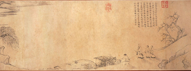 乔仲常的《后赤壁赋图卷》先是以它卷末以及靠后三分之一部分描绘石头的具有奇异力量的线条笔触,一下子吸引了我的注意,于是我接着不按次序从左至右地看了这幅长卷,然后才是从右至左,仔细看了它所记录的一次夜游赤壁的经过:初冬,木叶尽脱,月光明亮,没遮没拦地照下来,江面开阔,童仆被差遣去江边买鱼,妇人和孩子站在屋门口,看上去是在说“那你们去吧”之类的话,给他们准备了酒,四周非常安静,他们站在那里很冷,女人孩子等他们离开以后就要睡觉了;接下来的画面出现了水声,寒冷以及月下江流之声、山高月小之景唤起的心潮涌动叫人打寒颤,但坐在江边的诱惑令人可以忍受这一切,他们在面前摆开酒食,身后的树林十分深幽清寂;后来他们乘一小舟放乎中流,与一只孤鹤相遇;最后有一座藏在岩石包围中的宅院,院门关闭,犹如一个“完:大梦一场——到此结束”的提示,屋里的人坐着在交谈,并没有在睡觉,增添了梦里梦外恍惚的感觉。因为看完后的怅惘,我又看了很久宅院左边那块大石头。
