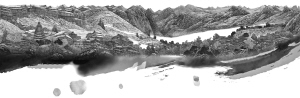 这幅大气画作的创作主题是山寨,把广西4个人口最多的民族——壮、瑶、侗、苗民居聚于一画,按4个民族的居住习惯行笔布局,通过山形地貌、民族建筑的变化融通,把山石、梯田、坡地、鼓楼、风雨桥及壮、苗、侗、瑶的民居特色融入笔端。