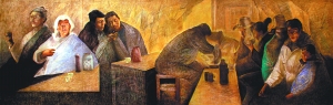 底层民众的“喜悦”和西藏知识分子的苦闷、苦痛,构成了分裂的景象,但在本质上,民众的苦痛是被遮蔽的,它呈现为一种淡漠、理性、顺受甚至喜悦的形态。宗教的力量,制造了超越,推动民众完成对痛苦的消解。横亘于茫茫高原的多重痛苦,源于多向度的错位与冲突——藏与汉、宗教信仰与世俗经验、历史传统与现代性、牧耕命运和城市生活,如此等等。包括绘画在内的精神生活,就是要瓦解这种苦痛,从图像的缝隙里寻找永恒的欢乐。这欢乐洋溢在草原和帐篷的风俗之中,也停栖在画家的“静观”之中。阿太的《汲水女》和《康巴汉》,就是这“静观”的成果,线条与块面的装饰性,风格凌厉而柔软、粗犷而细腻,逾越了传统的悲苦表情。