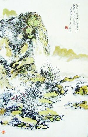 和入蜀前画风相比:线条运用注重起承转合,愈加率意奔放、劲健虚灵;皴法亦变得丰富,较之贯用的长披麻皴化为长短不一,方向不同,线性不同,顺锋逆锋交错互用;浓、淡、尖、圆、竖、卧多种形状的点子皴浓密厚重、聚散有致;同时注重了水、墨、色的浑化融合,丹青隐墨,墨隐丹青。