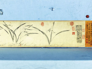 天津博物馆藏赵孟坚《水仙图》卷为纸本,纵25.6厘米,横675厘米。全卷以白描(中国画的一种绘画形式,是用毛笔墨线勾描轮廓)线勾为主,以细长流利而匀净劲秀的线描勾勒花叶,用淡墨晕染出阴阳向背,将水仙幽静、婀娜的姿态表现得淋漓尽致。同时也反映出作者超然脱俗的清高气节。《水仙图》卷原无题款,仅在画尾上角钤一朱文方印“彝斋”。包首有乾隆行书题签“赵孟坚白描水仙真迹”。卷首赵孟坚自题书法水平不高,是后人作伪妄加的。拖尾有元代潘纯题诗,但元代张楧、刘笏、张伯淳三人题跋,乃是从《赵子固水仙图并题长卷》移录的。此卷“用笔尖细、流利,坡草尤极飘洒飞舞,从画笔以至纸质、墨气来看,确是宋人真迹无疑。”赵孟坚的传世作品不多,天津博物馆藏《水仙图》卷保存完好,是研究赵孟坚笔墨风格的重要资料。