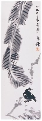 李苦禅,原名英,号励公,当代杰出的书画家、美术教育家。李苦禅的这幅《八哥蕉石图》轴,纵111、横34厘米,纸本设色。作品恪守中国传统绘画法规,融中西技法于一炉,水墨淋漓,笔意疏朗,虽不见芭蕉树的完整体态,但虚实相生,蕴涵风雨阳光无限生机于其间,自有一番“一叶知秋”的独特写意流露画端,真是胸有丘壑意在笔先。水墨的情致,漫漶于大自然中的生活气息,文人式的抒情呼之欲出,飞白部分布局合理,意象耐人寻味。cDn-www.2586.waNG画面上,一片硕大的芭蕉叶从上而下婆娑纷披,中间使用中锋淡墨勾勒粗大的主脉,两侧平行的分叶脉则用侧锋深墨绘就,娴熟地运用了破墨法的技巧,墨色融合,自然率真,有一气呵成的美感。细细观之,椭圆宽大的芭蕉叶就像炎炎盛夏里的一把伞,带给人们一片舒适凉爽的感觉。线条如行云流水,苍劲朴拙,墨色浓淡相宜。垂下来的顶部自然弯曲,似被风吹拂轻轻飘动,又仿佛在季节的嬗递中日渐老去而开始弯曲,既显得动感十足,又充满沧桑之态。一株梅树从画面底部的山石边斜斜地向上生长,虽不见根部,但粗细对比强烈,更显梅枝的遒劲有力。梅枝的一部分被下垂的芭蕉叶遮盖处的山石上,一只黑色的八哥静静地站在那儿,翅膀收敛,尾巴下垂,正扭头回望着什么,或许是在等待同伴,或许是在侧耳聆听某种来自大自然的声音,显得憨态可掬,十分可爱,达到了笔墨无言、境界自生的艺术效果。山石、梅枝和八哥都只有寥寥数笔,看似随意挥洒,实则笔法凝练简约,尤其是八哥额羽丰盈、双翅八字白斑的外形特征以及性特延长竖立的特点刻画得惟妙惟肖,具有笔墨厚重疏放、形象洗练鲜明、笔简意繁写意的艺术风格,使画面意趣盎然,充满生气。画面右上空白处有作者自识:“一九七二年冬月,苦禅”,钤白文“李英之印”印。可见这幅画创作于1972年的冬天,李苦禅时年73岁,为其晚年的作品之一,现收藏于武汉博物馆。
