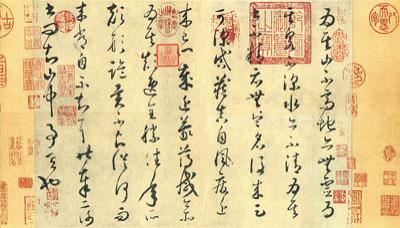 现藏于辽宁省博物馆的怀素《论书帖》(见上图),为暗花笺纸本,草书,纵28.6厘米,横40.5厘米,共9行85字。从艺术风格上看,《论书帖》不同于怀素其他如《自叙帖》、《食鱼帖》等用“古瘦”和“半无墨”的毛笔创作的笔意连绵不绝、体势险绝诡奇、极度夸张浪漫的狂草之作,笔下明显洋溢出东晋王羲之恬淡平和的风神气息。此帖运笔悠然自得,意气平和,应规入矩,精谨而纯熟。其每作一字,起落分明,虽无纵横捭阖之势,但由于擅长驾驭中锋,故能做到笔势圆融婉转、飞动轻灵,骨气深稳,血肉丰润。虽偶作牵连映带,但亦无拖沓之嫌。笔墨流宕处,英姿勃发,气象超然。其结构以平正恒定基调,疏密聚散之间,显露出“端庄杂流丽,刚健寓婀娜”的风致。