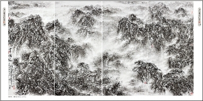 原来,焦墨画法不借助于水的渗化作用,虽然失去了破墨、渍墨、泼墨等诸多墨法凭藉,却能利用它的黑白灰手段营造出丰富多彩的视觉效果。万里长城的烟雾氤氲、风云变幻、奇石秀水在焦墨这种独特的表现形式下显得奇美而又灵秀。虽然仅仅一黑一白,却一阴一阳,一虚一实,一动一静,相生相发,相反相成,这也是独特的焦墨画法不同凡响之处。倘若用墨把握失当,就会捉襟见肘,甚至前功尽弃。