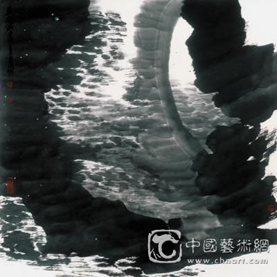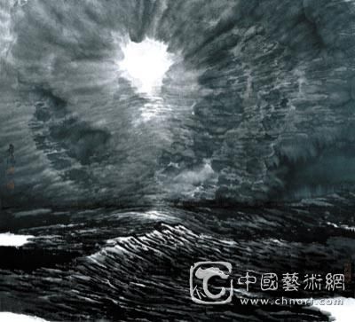 时空水墨画的艺术特质:以“云法造境”创作方式构建的“时空水墨画”,与传统山水画完全不同。作品表现的不是大自然中的一山一水、一草一木,而是宇宙时空演化的大律动、大节奏,一种似云、似海、似山三位一体的大自然宏观美感和生生不息的时空境界。在具体创作中,它超越现实时空的物理规律,以主观想象的时空观念作为视觉形象的寄托,把天空、地面、山川、江河、大海看成是一个整体,展现了洪荒初辟、天地空濛、日月辉映等种种奇特神秘的时空境象,创造出包容宇宙天地、气势浩大雄浑、意境博大深沉的时空水墨系列作品。
